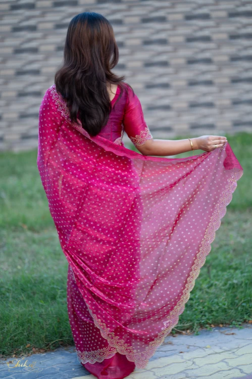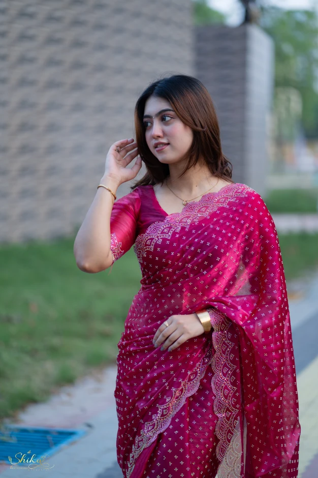 প্রিমিয়াম ইন্ডিয়ান স্টোনের জর্জেট পার্টি শাড়ি (রাণী গোলাপী )
